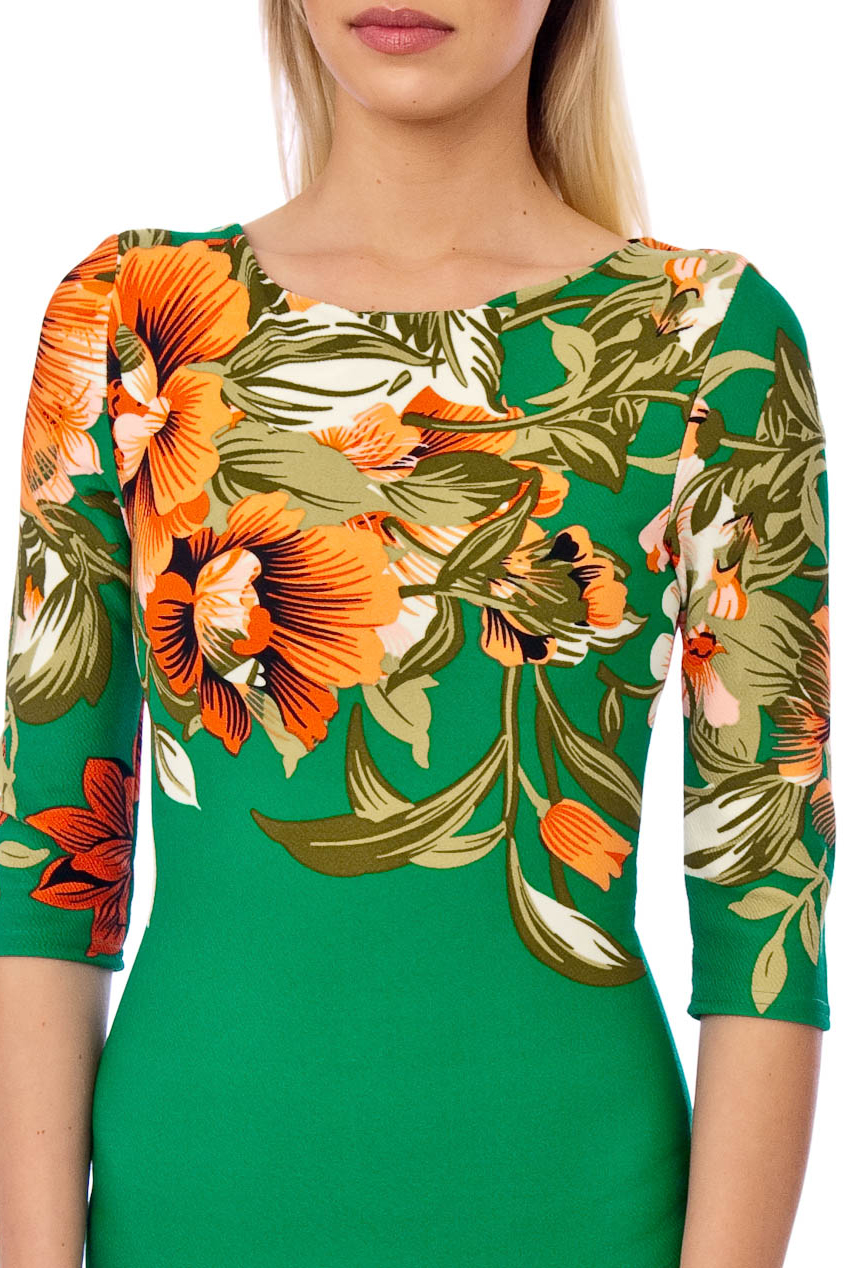 The unique Ursula 60s Floral Wiggle Tropical Dress In Emerald retro dress falls below the knee to a midi length style and zips to the back with a central concealed zipper.