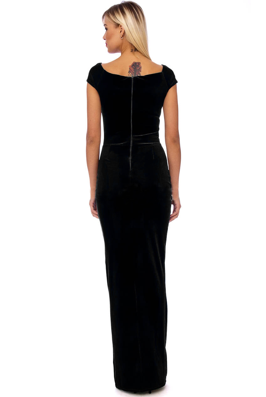 This velvet number is fully lined and the maxi length style unfolds to a floor length style in a fabulous fitted pencil dress fit.